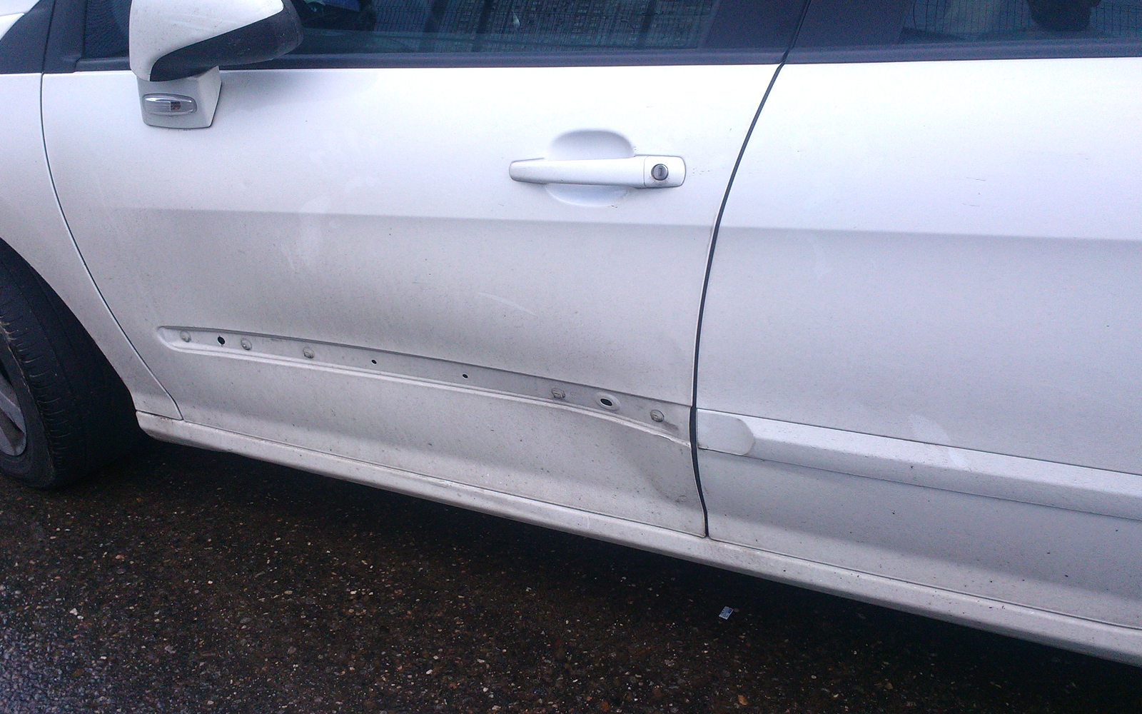 2. Замята водительская дверь отсутствует молдинг, сколько стоит работа + молдинг есть ли возможность сделать без замены двери и покраски? (Фото)