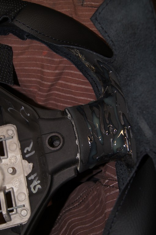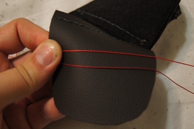 Пришлось потрудиться . Это мой первый опыт подобного рода , поэтому некоторые места переделывал по второму разу. Как и советовали , сшивал отрезками нити . Очередность напрашивалась такая : низ - боковины - верх . Ей и следовал . Закрепляял концы в швах , а на тыльной стороне - в кожу , под клей и загиб . Клей (обувной Момент) , кстати , применял только на швах , на спицах и частично на верхней вставке , о чем потом пожалел . Увел шов в сторону и не смог исправить перекручиванием , пришлось расшивать и сшивать отрезок заново . Ниток хватило с запасом на все переделки . Излишки клея , вылезшие через перфорацию легко удаляются , после подсыхания , трущими движениями пальца. То , что осталось в дырках не поленился потыкать иголкой (зубочисткой).